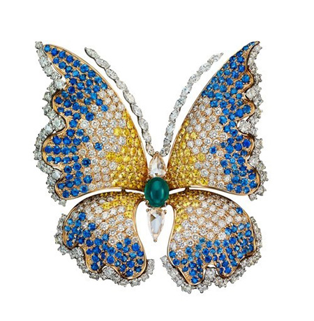 FANCYCD高级彩色宝石胸针:由单面切割祖母绿,玫瑰型切割钻石,蓝宝石,马眼形切割钻石和圆形明亮形钻石形成。