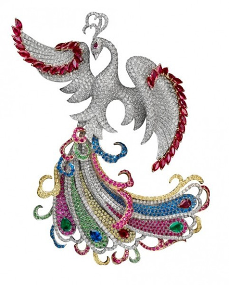凤凰的灵感出自《诗经?大雅?卷阿》中的诗句“凤皇于飞,翙翙其羽”,古老诗歌对爱情的描述,祝福着每对缱绻不离、形影相随的美满姻缘。2012年是中国龙年,这枚绚丽夺目的凤凰胸针,同时寓意“龙凤呈祥”。