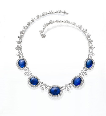 FANCYCD高级彩色宝石项链:天然无处理蓝宝石总重52.08克拉,配以12.08克拉钻石。