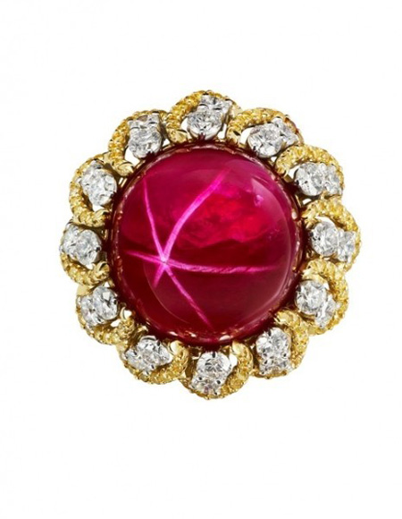 FANCYCD高级珠宝设计师用绝世美艳的星光红宝石向维多利亚女王致敬,六道华丽星芒宛如她当年的璀璨光华;维多利亚女王的英明执政时期,大英帝国被称为“日不落帝国”,所以这枚星光红宝石戒指的周围以浓艳黄钻和无暇透明级钻石组成太阳花的形状来纪念这段辉煌历史。