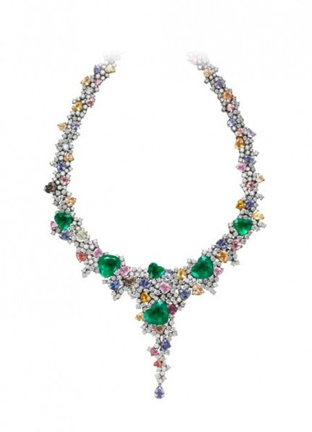FANCYCD高级彩色宝石项链:由九颗总重26.07克拉的祖母绿组成,配以27.10克拉白色钻石以及7.43克拉浓艳黄钻。