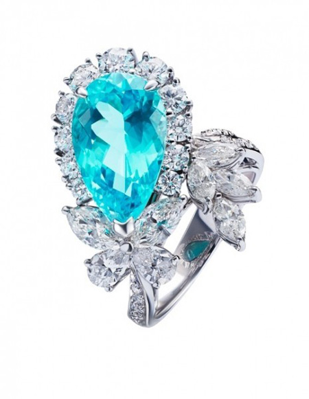 这枚FANCYCD水滴形帕拉伊巴碧玺戒指,专门以无暇透明级钻石和铂金衬托出它的纯净,如天使的泪滴,落在幸运花上。谁将它戴在指间,开始一段爱的传奇。