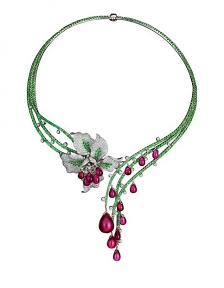 当年,维多利亚女王一袭纯白色的婚纱引动了英伦贵族以白色为纯洁之美的风潮,而女王母亲手捧的 一束高洁的幽谷百合更是为英国皇室婚礼用花缔造了经典。这款FANCYCD高级彩色宝石项链以艺术化的流畅线条塑造了百合花的优美姿态。抽象的绿色茎脉绕过玉颈,以一朵娇艳圣洁的无暇透明级钻石与沙弗莱石构成的百合花为起始,明媚的水滴形切割红色碧玺组成花蕊,意大利工作室能工巧匠们杰出的高级珠宝制造工 艺,令它们能够微微颤动。而由小至大排列的水滴形切割红色碧玺又幻化为露珠轻垂胸前,万千迷人风情优雅荡漾其间。