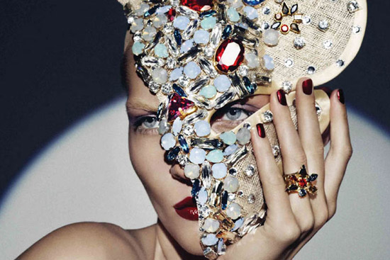 匈牙利名模Karolin Wolter Shines为德国VOGUE拍摄星座特刊,配戴多样Swarovski元素所耀眼组合成的样式,不论是利用水晶构成的绮丽的脸部,亦或者是花朵藤蔓等大自然的元素依附在model脸上所构成的华丽美景,还是赤裸著上身仅由珠宝、水晶所制成的华衣等多张图像诠释,每一张的呈现都是如此的美丽与璀璨,万花筒般的多彩宝石,呈现出如此前卫且神圣的视觉美,仿佛是场异国情调的时尚庆典。