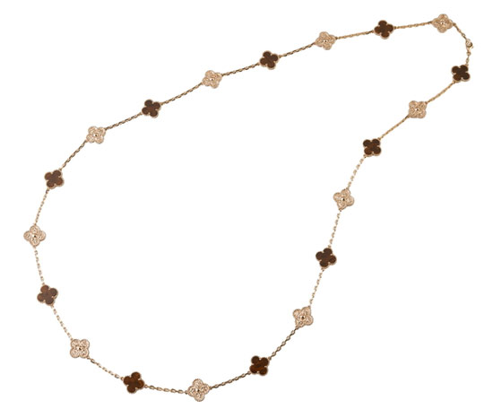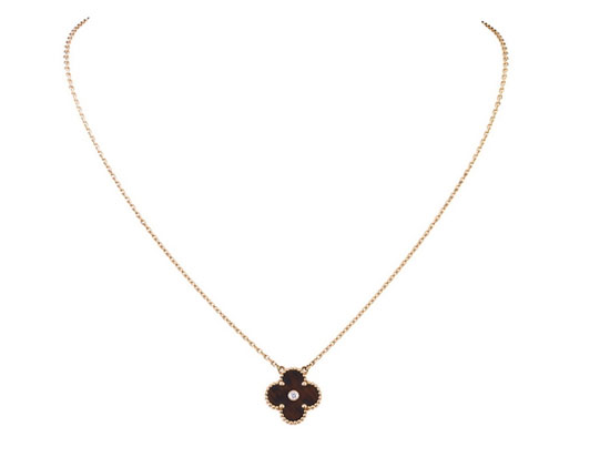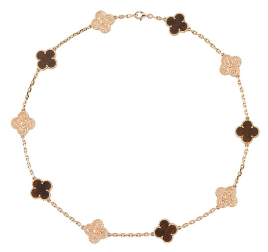 全新 Vintage Alhambra 编号限量版系列共包含五件作品:长项链、项链、钻石吊坠、手链和耳环。玫瑰金与蛇纹木在各种象征幸运、真爱、健康与财富的图案中交相辉映。
