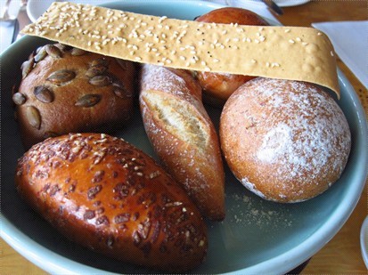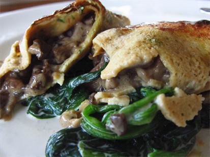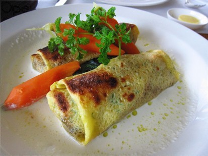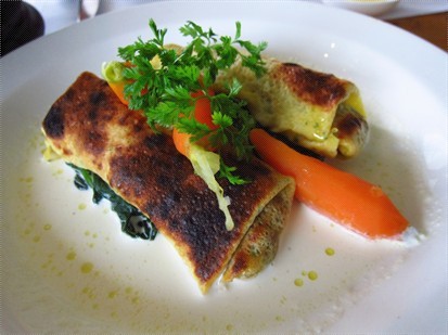 我点了焗蘑菇,炒菠菜,胡萝卜粉卷,收费$220,一点也不便宜,但若是有水准也不打紧,谁知说难听一点,这道菜连「意粉屋」也会做得比他好。两件粉卷包着杂菌,馅料本是不错,有蘑菇和羊肚菌,羊肚菌气味芳香,是西餐的矜贵食材,用白酒和轻忌廉炒过,以一块薄班戟 (crepe) 包着,垫以炒菠菜和三条小胡萝卜,味道不错,问题出自两块薄班戟,一块焗至半黑了像锺无艳,而另一块则全黑像包丞,焦黑一片,卖相奇差,也许不是来自大厨的手笔,而是厨房小厮的杰作,但最难明是这副德相也可通过各级人员,送到客人面前,不是水准回落,是甚麽?