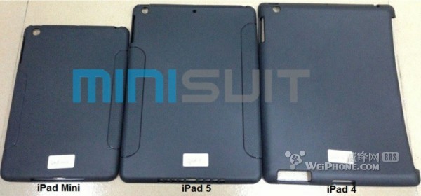 从图上我们可以看到 iPad 5 的保护壳比第四代 iPad 的外壳更小,佐证了此前的谣传下一代iPad的设计趋同于 iPad mini 的消息,侧标的遮光板更小。在 iPad 5 保护壳上还多出了一个小孔,这个是为麦克风预留的。在现役 iPad 上麦克风是在设备的顶部,在 iPad 5上苹果再次将其位置调回机身背后。另外 iPad 5 外壳设计的棱角没有 iPad 4 明显,所以可以确定 iPad 5 比 iPad 4 机身更薄,采用的是 iPad mini 斜切边式设计。