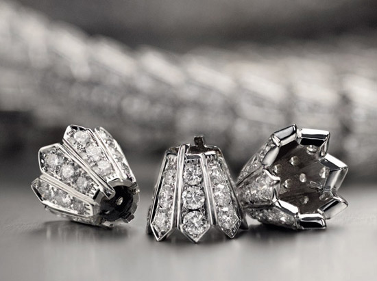 为模拟蛇头优雅完美的轮廓,三个组件分别饰以密镶钻并由小到大渐次衔接,立体构成Serpenti优雅华贵蛇型项链的头部。