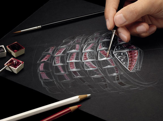 Serpenti系列手镯 手绘设计图稿。此款5排白金手镯的贵金属材质选用了红宝石与钻石, 蛇型手镯的主体由一系列组件衔接而成,模拟蛇的天然鳞片。每个组件的侧面和底部均为镂空设计,在镶嵌钻石后仍能保证光线通透中央,凸显美妙的嵌工。