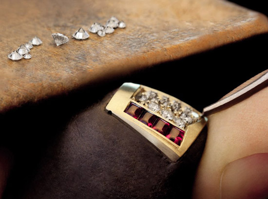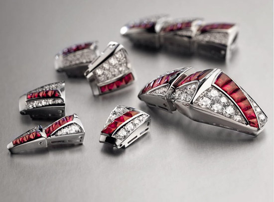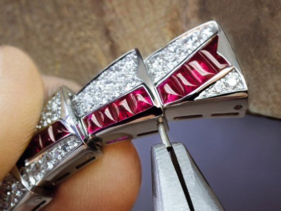 蛇身鳞片上间以红宝石,亦嵌入明亮式切割的钻石。为达到手镯如行云流水般的曲线效果, 明亮式切割钻石规律的镶嵌在鹅蛋型切割红宝石周围。