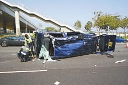 据香港《大公报》报道,香港大埔吐露港公路发生客货车翻侧惊险交通意外,一辆客货车昨午(23日)驶经科学园对开时突然失控,两度狂撼路中石壆(石墩),再反弹路中滑行逾70米后翻侧,车头严重毁烂,尾轮飞脱,车上一对男女受伤一度昏迷,经送医院抢救后苏醒,伤势严重,现场交通严重受阻近两小时。
