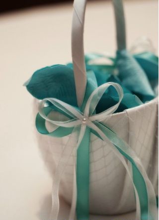 花篮是我自己重新改装过的,原先买来的时候只有白色,楼主自己加了Tiffany蓝色细丝带,花瓣网购来的