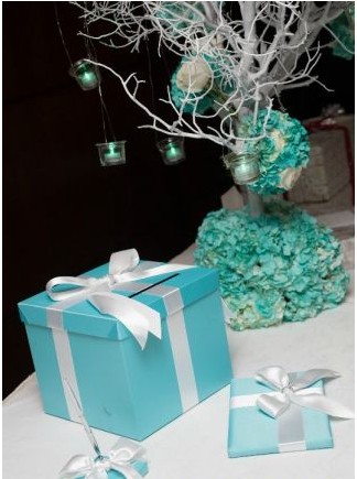 餐桌整体布置, Tiffany蓝的桌布(楼主租来的), 喜糖盒子设计成Tiffany盒子, 餐桌号码牌同样Tiffany蓝: