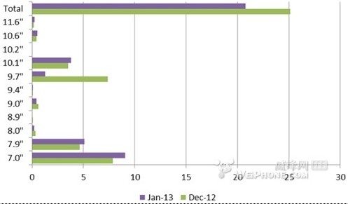 实际上,9.7 英寸 iPad 在今年 1 月份的表现不止是低迷而已,NPD 给出的描述词语是“崩溃”(collapsed),因为全尺寸 iPad 在 1 月份的预计出货量只有 130 万台,与去年 12 月份的 740 万台相比可以说是“天地之差”,而这也是苹果调整 iPad/iPad mini 出货量的最主要原因,同时也反应出 iPad mini 令人吃惊的增长速度。