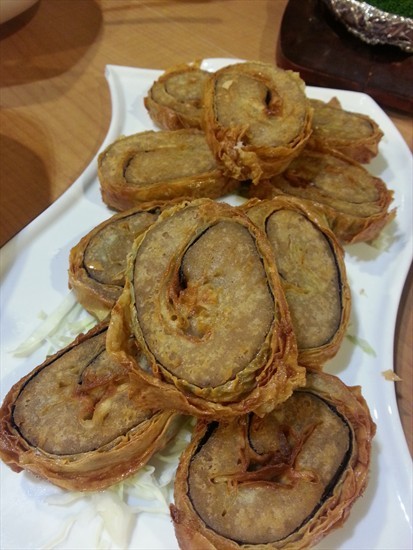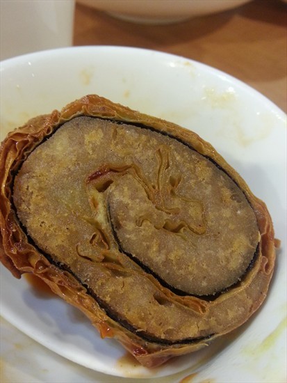 这是我是晚最喜欢的一道, 芋头是秋天的时令食物,又要算一算,这个秋天真吃了不少时令食物, 还真的没有太刻意的要吃最时令食物,但总是有意无意的便吃了... 言归正传, 紫菜外放上一层腐皮, 再卷起芋头蓉,切片後再煎至香身,质感是硬脆的,但偏偏我就是酷爱这种口感,可以多嚼几口,很有咬劲, 另外亦富有粉香芋头的味道与口感, 不沾酱也不错。沾酱的话又是一道酸甜的菜色, 令较为乾身的荔芋卷加了一点湿润感,也好吃。