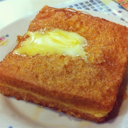 西多士 - 另一最爱,小时候周末跟同学仔到附近玩耍,肚饿了便凑合各人手上的零用钱,夹份食西多士配冻奶茶做下午茶。西多士很厚身,蛋味很重,盖在上面的炼奶和牛油很快便融掉了,中间还夹着一层花生酱,用料十足,绝对不是一般连锁式快餐店可比。今天就跟友人分享,一人一半,味道真不错!