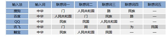 首先是词语联想能力,输入一个词汇后输入法若是能够迅速地联想到一些人们经常输入的下一个词汇,则可以大大提高我们的输入效率。小编试着分别用五种输入法输入“中华”二字,然后对比各自给出的联想词: