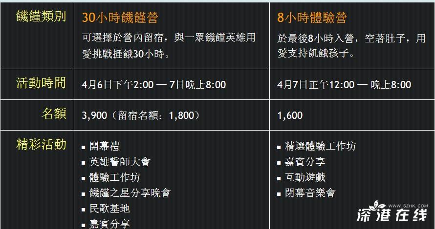 今年「饥馑叁十」将于4月6至7日(星期六下午2时至星期日晚上8时)在香港仔运动场举行,参加者可选择饥馑30小时(最低筹款额为1200港元),或饥馑8小时(最低筹款额为400港元),名额5500个
