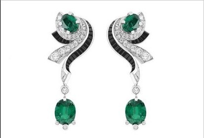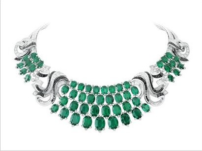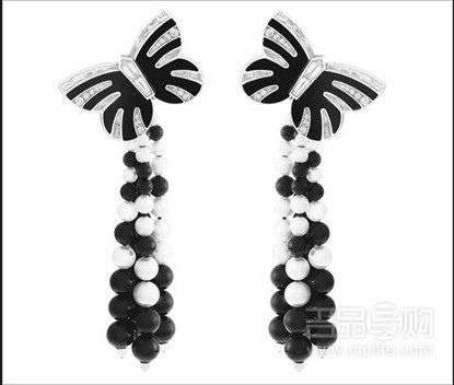 Moments de chance 虎斑蝶饰黑白套件以为虎与蝶象征阴阳,利用缟玛瑙与钻石的对比,凸显勇猛与纤细。而 Lierre 项链则以常青藤的叶片作灵感,用 56 颗总重 98.62 克拉的椭圆切割赞比亚祖母绿镶成常青藤,绿色象征希望,为整条项链更增幸运之感。