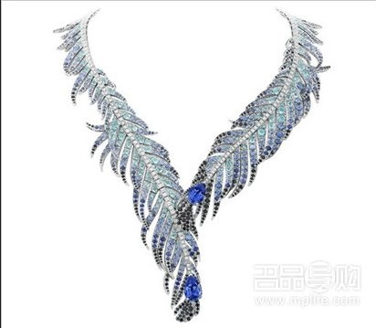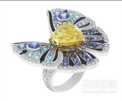 Plumes de Martin-Pêcheur 项链及耳环从翠鸟的蓝色羽毛中汲取灵感,各自镶嵌 2 颗、分别重 11 克拉和 4 克拉的梨型蓝宝石,并镶嵌黑色尖晶石与钻石,及缀以帕拉伊巴碧玺,组成渐变蓝色,充满光泽。Trésor Ailé 戒指则以蝴蝶作灵感,翅膀镶嵌了颜色渐变的蓝宝石和紫色蓝宝石,边上围绕着圆钻,中心镶嵌一颗 5.73 克拉的心形黄钻,再用黑色亮漆勾勒出蝴蝶线条,更显动感。