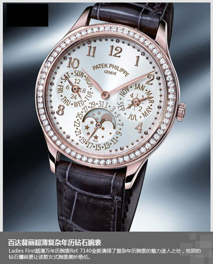 作为腕表女王的百达翡丽,其傲人霸气的风格宛如职场上事业成功的女强人。Ladies First超薄万年历腕表Ref. 7140全新演绎了复杂年历腕表的魅力迷人之处,不仅注重外观优雅,同样珍视内在价值。 Ref. 7140 Ladies First万年历腕表是一款超薄自动上弦机械腕表,采用的日历装置可以自动计算每月的天数并能准确的显示闰年的2月29日,表圈上镶嵌的炫丽钻石更让该款女式腕表美妙绝伦。