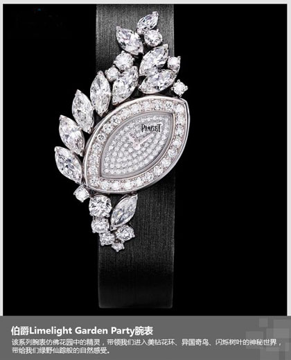该系列腕表仿佛花园中的精灵,带领我们进入美钻花环、异国奇鸟、闪烁树叶的神秘世界,带给我们绿野仙踪般的自然感受。这款腕表所镶嵌的钻石数量和克拉数让我们震撼,钻石款镶嵌了164颗美钻,约7.5克拉。伯爵曾经这样比喻Limelight系列:“如果把钟表制作形容为一部电影,Limelight腕表就是在相机闪光灯下绽放星光的明星,吸引众人目光。 Limelight系列秉承了首批伯爵珠宝腕表的风格,不断创新的款式依然闪烁着耀眼的华丽光芒,宛如一张踏上红地毯的邀请函。”