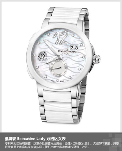 专利双时区快调装置,这革命性装置亦应用在「经理人双时区女表」。无须卸下腕表,只要轻按表圈上的高科技陶瓷按钮,便可将时针迅速地调校至另一时区。不论是出国或是与爱侣及时相聚,双时区系统都是个既实用又方便的腕表功能,适合在原居地和出国时佩戴。「经理人双时区女表」的纯白优雅设计,加入一个层次丰富的珍珠母贝表盘,钻石闪烁耀眼。表盘上的阿拉伯数字以钻石作点缀,增添一份戏剧玩味,钻石时标则低调地绽放耀眼光芒。