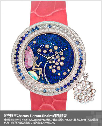 翩翩舞者、迷人仙子、展翅飞燕和花衣蝴蝶,既是世家最钟爱的主题,也是世家最大的灵感泉源。全新Ballerine Enchantée以腕表制作和想象力谱出颂赞时光和动人缪思的诗篇,设计流丽优雅,微风悄悄轻拂表盘,为腕表注入一息生气。透过黄金雕刻、珍珠母贝微绘和剔透亮漆,将瑰丽的梦境化为现实,更为每一枚腕表的外圈镶上三圈经过严苛甄选的具有“灵魂之美”的钻石和彩色宝石,幻化为一幅幅令人心醉神迷的美景,并以丝丝入扣的精致镶工演绎灵动与生机。