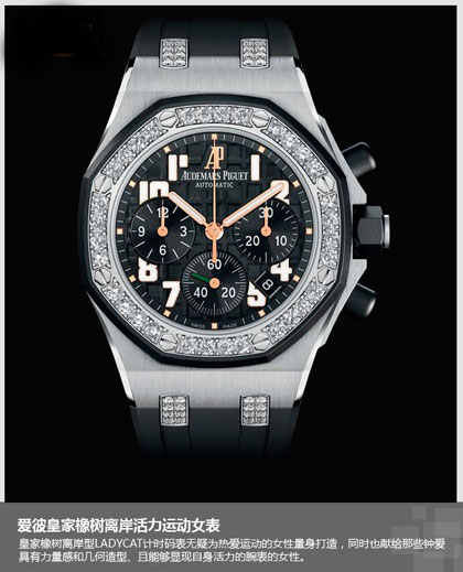 皇家橡树离岸型LADYCAT计时码表无疑为热爱运动的女性量身打造,同时也献给那些钟爱具有力量感和几何造型、且能够显现自身活力的腕表的女性。皇家橡树离岸型Ladycat计时码表白金款配备黑色珍珠贝母计时盘,表圈、表壳和折叠表扣上共镶嵌323颗钻石(约重5.82克拉),而黑色橡胶表带更能衬托出爱彼精挑细选钻石的璀璨光芒。精钢款线条明快简洁,表圈和链节铺镶明亮式切割钻石,与表带完美整合。防水性能达50米 (5 bar),这一精华荟萃的腕表,对力求彰显无畏气魄的女性而言堪称理想之选。