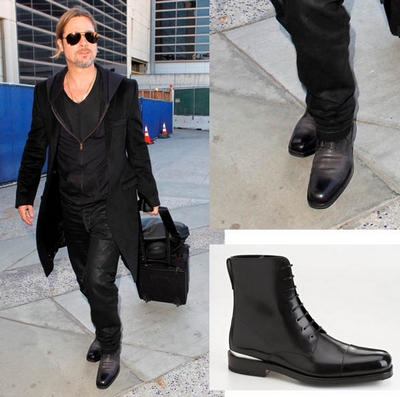 3月街拍,布拉德·皮特穿着一身黑,再配上一双黑色菲拉格慕短靴,酷劲十足。