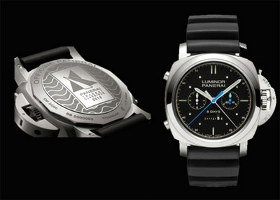 沛纳海2013年推出47毫米8日动力储存钛金属双追针计时全新高级腕表(Luminor 1950 Rattrapante 8 Days Titanio)。腕表设计精巧典雅,采用直径47毫米磨砂钛金属表壳,备有经典表冠护桥装置,锁上表冠,确保防水程度高达10巴(相等于深度100米)。黑色表盘设计简约,由两个互迭的表盘片组成,中间涂敷 Super-LumiNova? 夜光物料——此为沛纳海(Panerai)腕表自1930年代起的结构特色,有效确保腕表于黑暗和在水底情况下发挥极佳的辨读性能。搭载的精密P.2006机芯,动力储存长达8日,同时还具有双秒追针功能。配备刻有品牌标志的橡胶表带。