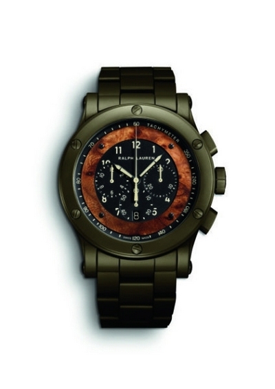 借由猎游系列的美学元素,Ralph Lauren Automotive汽车腕表得以重新诠释,以创新型树脂压铸钛合金表壳搭配榆木表盘,形成奇妙的对比。RL67 Automotive采用以超轻重量和超高强度而着称的创新航空材料,进一步彰显出这款新腕表的前卫特色。这款全功能型腕表直径45毫米,造型强劲有力,极具阳刚气,但却惊人的轻巧,在力量与舒适之间找到了理想的平衡。RL67 Automotive搭载RL751A/1型表厂制造自动上链机械机芯,经典表盘设计,内嵌Sporting系列传奇表款Automotive汽车腕表的特色装饰元素——榆木。