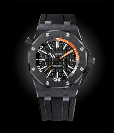 新款皇家橡树离岸型潜水腕表,为潜水爱好者和需要应对各种极端环境的人士而量身定制,拥有强劲有力的曲线,适用于深海和任何不容许丝毫误差的极端环境中。今年的新款式将首次配以深黑色高科技陶瓷制成的表壳、表圈和易于操作的表冠。为提高在漆黑深海中的读时清晰度,首次在黑色表盘的品牌传统 “Méga Tapisserie” 超大型格状饰纹上搭配橙色荧光指针,而且和旋转表盘内侧圈的潜水刻度尺上的12时至3时的橙色显示区相呼应。这种绚丽的色彩便于潜水者即时读取时间信息。搭配橡胶表带和钛合金针扣,是无论直接佩戴或戴于潜水服外,均可佩戴得宜。