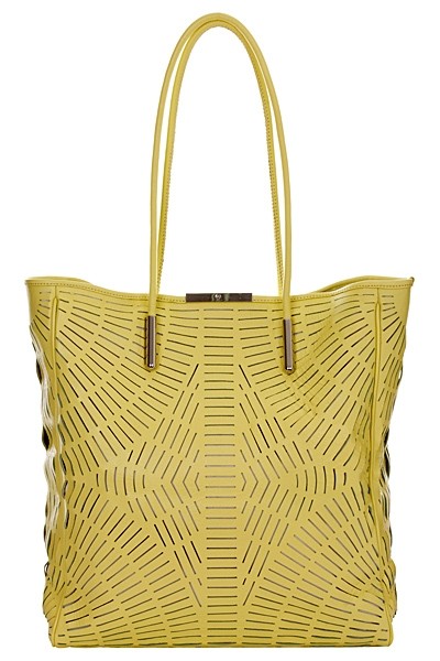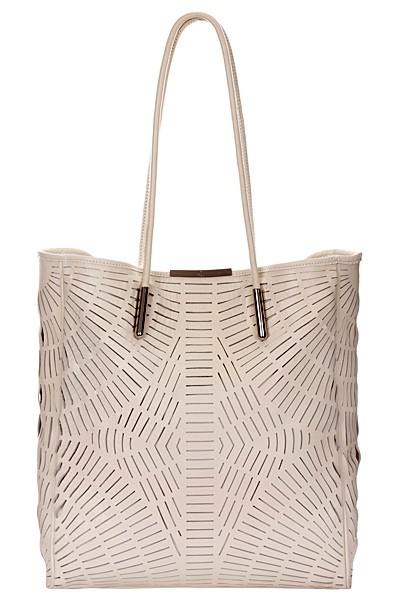 Alexander McQueen 2013春夏系列将简单的购物袋变得更潮,几何镂空图案的点缀与彩色皮革混搭出前卫清新的时尚气质。