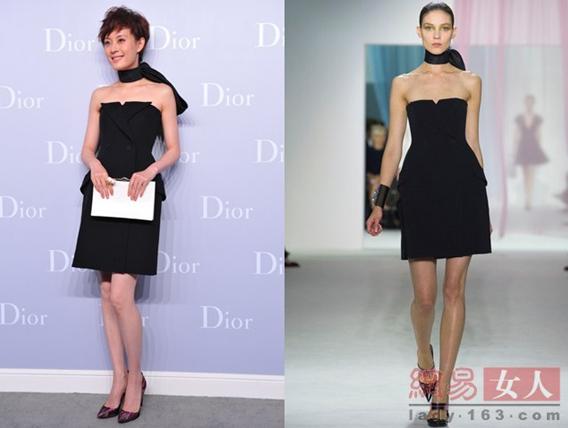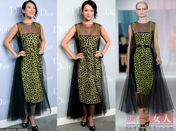 章子怡身着dior2013春夏系列的黄黑色连身裙出席活动。这身造型失败最大的原因就是服装选错了。这条裙子本身就是dior这一季比较失败的作品,肩部的黄色装饰制作得很随意,不够精致;外罩的黑纱纯属多余,破坏廓形;最糟糕的是长度比例,模特穿的都很悲剧,身高并不很高的章子怡自然也步模特后尘。黑色鱼口鞋老气。