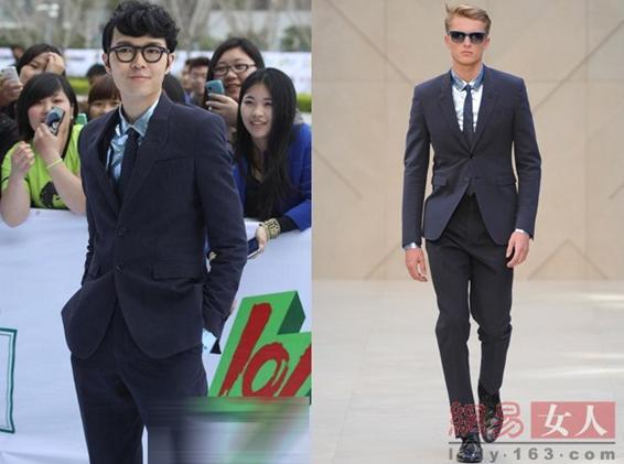 方大同身着burberry2013春夏男士系列套装亮相。方大同每次穿burberry都不错,他很适合这个牌子。不过,两粒扣西装上衣还是只扣上面一个扣子比较好看。