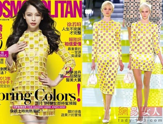 徐若瑄身着LV2013春夏黄色方格连身裙登上杂志封面。这种活力又现代风格的裙子不适合搭配卷发和红唇红指甲。2、这优雅风格的长项链只有毫无时尚感的人才会去搭配。3、这封面的配色真是让人不忍再说。