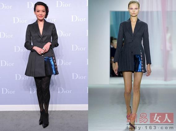 舒淇身着dior2013春夏系列灰色裙式长外套亮相。乍一看还不错,但细看却发现很多败笔。作为奇异丝袜控的舒淇,再次用一条丝袜拉低了整体造型的档次;挑染的红发不仅没增加亮点,反而显得俗气。