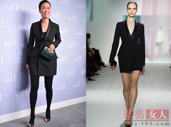 那英身着dior2013春夏系列黑色裙式长外套亮相。new look造型的夹克式连身裙中性风十足又凸显身材,大耳环增加了60年代风情,一丝不苟的大光明清爽大气。黑袜有点多余,但突出玫瑰金色尖头高跟鞋,倒也可以接受。暗青色手包略显暗淡,但款式不错。