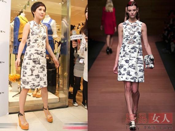 郭采洁身着carven2013春夏印花白色连身裙出席活动。整体比较清爽,裙子和鞋子的风格也比较年轻,适合她。裙子稍显长,衬托出手短;鞋子搭配得差强人意。