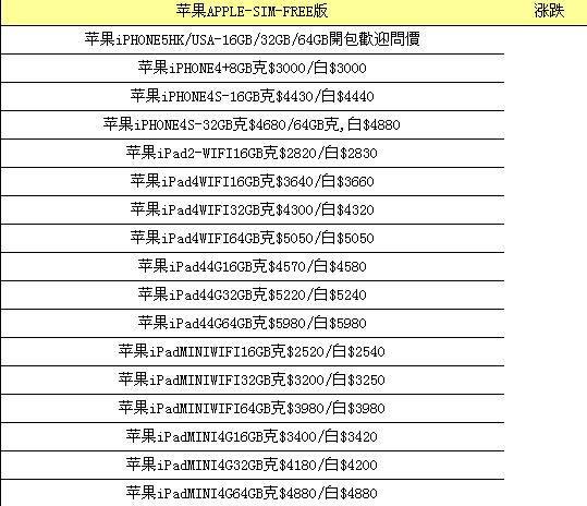 2013年4月7日香港手机报价:先达作为香港的水货手机圣地,同时也销售港行和后行,后行是指撕了保修标签的行货,花100元左右买一个标签贴上去就和行货无异了,而且能得到保修。我们为各位提供的是先达商家拿货的上层报价单,而这份报价单来自先达批货上层,可以说整个中国大陆从香港拿的货价格和这个报价单差异不大,绝对权威。