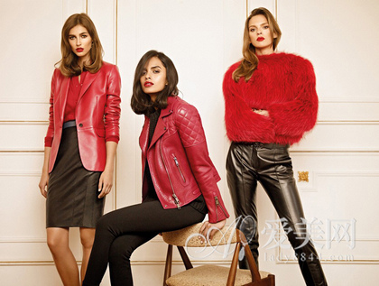 通身红色的装扮绝对让你艳压群芳。皮草围脖显示着该品牌的精致华贵,红色的皮质半身裙显示出女性的端庄俏丽。