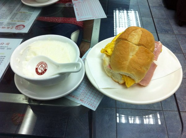 拿完燕窝走人,在路上找金店,还问表仙老婆借了周大福的卡号。突然一抬头,义顺牛奶公司。好吧,也是平时吃晚饭的时候了。不用排队,点了吃了,对面坐了一个很友善的美女,港人,两个人就聊天。她给我介绍了澳门猪扒包。我点了一份双皮奶和猪仔包。好吧,不是猪扒包,是猪仔包,那是为什么呢?因为我点错了。 吃完东西,到门口付钱。