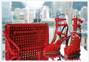 ◆红色Rockstud Rouge平底鞋(左/$6,800)、红色窝钉Clutch Bag(中/$22,300)、红色Rockstud Rouge搭带尖头高跟鞋(右/$8,600)。