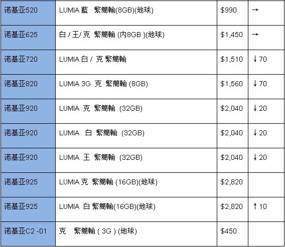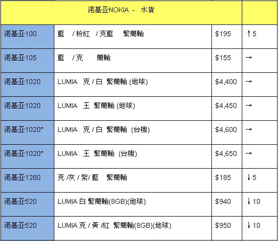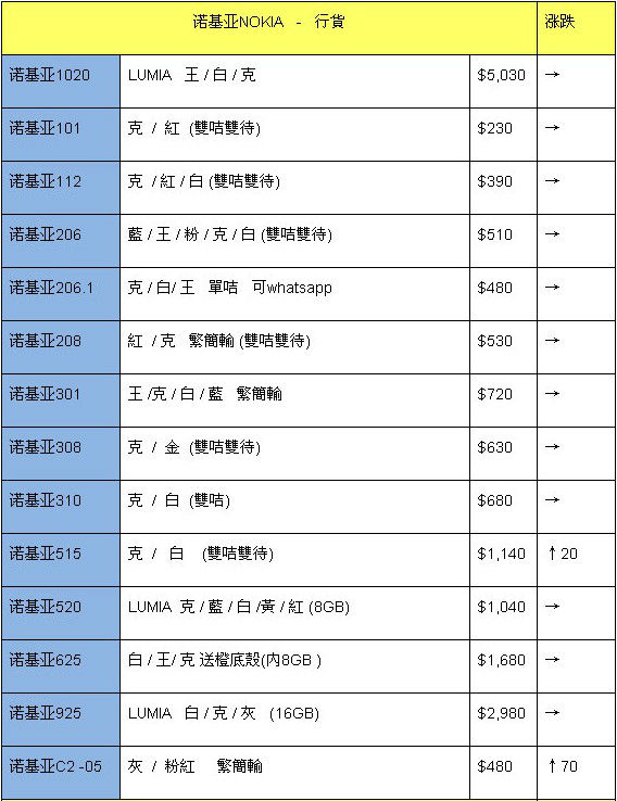 诺基亚的巨屏旗舰机也登场几周了,不过报价上依然没有出现,原因还是价格偏高,加上询问的朋友较少,所以商家可能保持观望,没有入货。看看目前的诺基亚机型,报价上最高端的是Lumia1020,行货和水货价格都比较稳定,不过询问香港先达卖场的商家得知,诺基亚的这些机型还是较少人询问,大多都关注平果和三星。而入门级机型和直板按键机型反倒更有人气,尽管不能够更主流热门机相比。例如亮骚的诺基亚515,本周小涨20港元。
