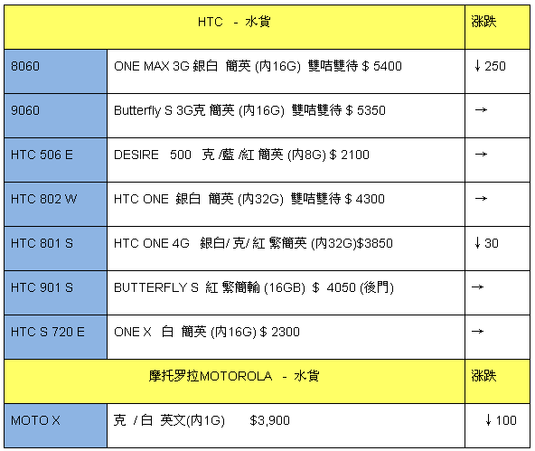 本周HTC、摩托罗拉手机行情——One Max水货下调250港元