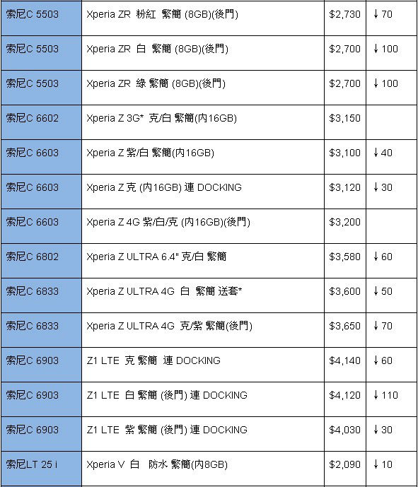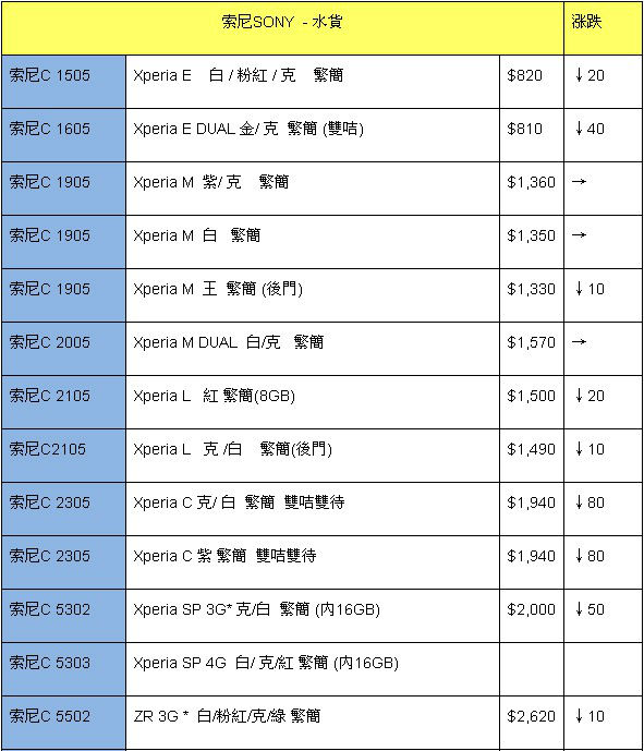 索尼手机自从出现至今,一直保持更新。在旗舰机Z1出现后,已经有一段时间没有新机的踪影,不过有消息称,新款Z1S也即将登场,新机可能不叫Z1S,或另取名字。回到本周的报价,入门级和中端的机型便不多解释,价格持续小降。关注旗舰热门机型,巨屏Z Ultra终于减缓了下滑,只有六、七十港元的降价,最低报价3580港元,实际性价比相当高,只因实在太大,所以才一降再降,大家也懂的。旗舰机Z1同样连续下挫,跌穿4K港元也是指日可待。