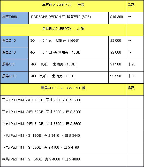 本周黑莓、苹果、LG手机行情—mini2加价200港元,土豪金约6150港元