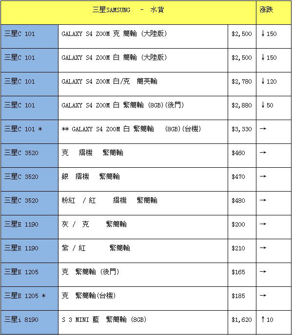 与目前市场主流价格方向一致,三星手机同样保持整体价格下滑,无论是热门机型还是特别的机型,都有不同程度降价。前几个月有人喜欢Galaxy S4 Zoom,因为镜头超大超拉风,还能变焦,完全是数码相机的配备,只因当时价格较高,所以没有下手,看!现在最低报价2500港元,即使商家加两百港元售卖,折合人民币也只有2100+,这个价格也不过是一台新款中端数码相机的价格了,当然,貌似还有下跌的空间。关注热门机型Note3,尽管没有当初Note2一般的火热,但人气还是十足的,本周价格小降价几十港元。另外S4的价格暂时变动不大,持续小幅度降价并没有带来过多惊喜,喜欢的朋友可以入手或是保持关注。