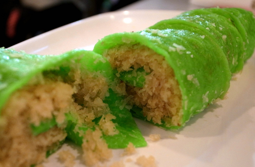驰名娘惹甜品,面粉混入斑兰汁搓成饼皮,包着经椰子汁炒香的椰子肉,饼皮烤到微焦,散发阵阵斑兰香,配椰子肉很香甜。